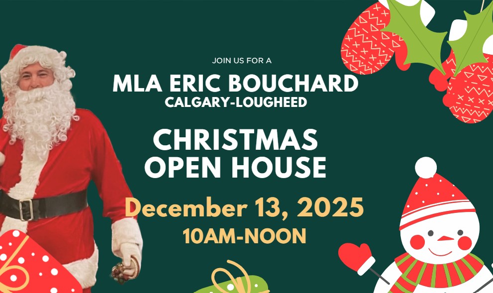 As we head into the holiday season, I’d like to invite you and your family to our Calgary-Lougheed Constituency office Open House on Saturday December 13, 10am-12noon at our office. It’s a great chance to connect with neighbours, celebrate the season, and share ideas for the year ahead. Details will be available through my constituency office and website, and I hope to see you there.